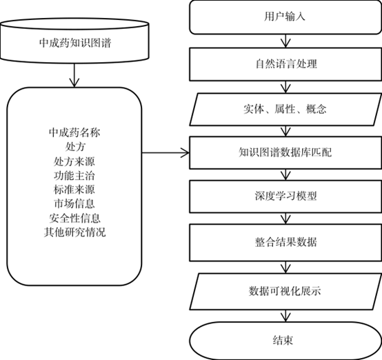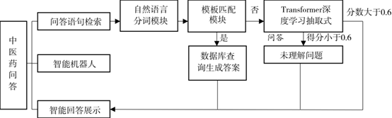 基于中成药知识图谱数据库和中成药知识图谱可视化平台,可用于进行中成药知识问答研究。借助自然语言处理技术,能够提取并表征中医药领域文本特征。通过结合使用基础的模式匹配技术和Transformer深度学习模型,可实现平台的中医药智能问答功能。具体实施流程如图6所示。