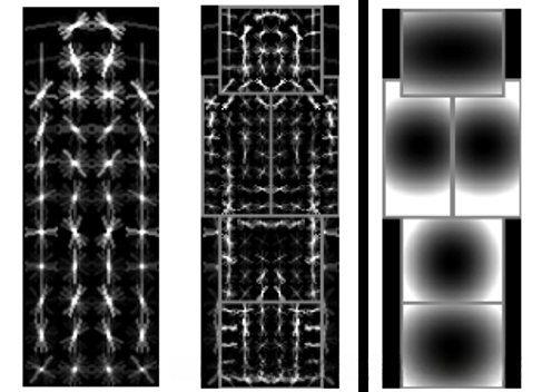 如图(a),根模型比较粗糙,大致呈现了一个直立的正面/背面行人。如图(b)所示,部件模型为矩形框内的部分,共有6个部件,分辨率是根模型的两倍,这样能获得更好的效果。从中,我们可以明显地看到头、手臂等部位。为了降低模型的复杂度,根模型和部件模型都是轴对称的。图 4.5(c)为部件模型的偏离损失,越亮的区域表示偏离损失代价越大,部件模型的理想位置的偏离损失为0。