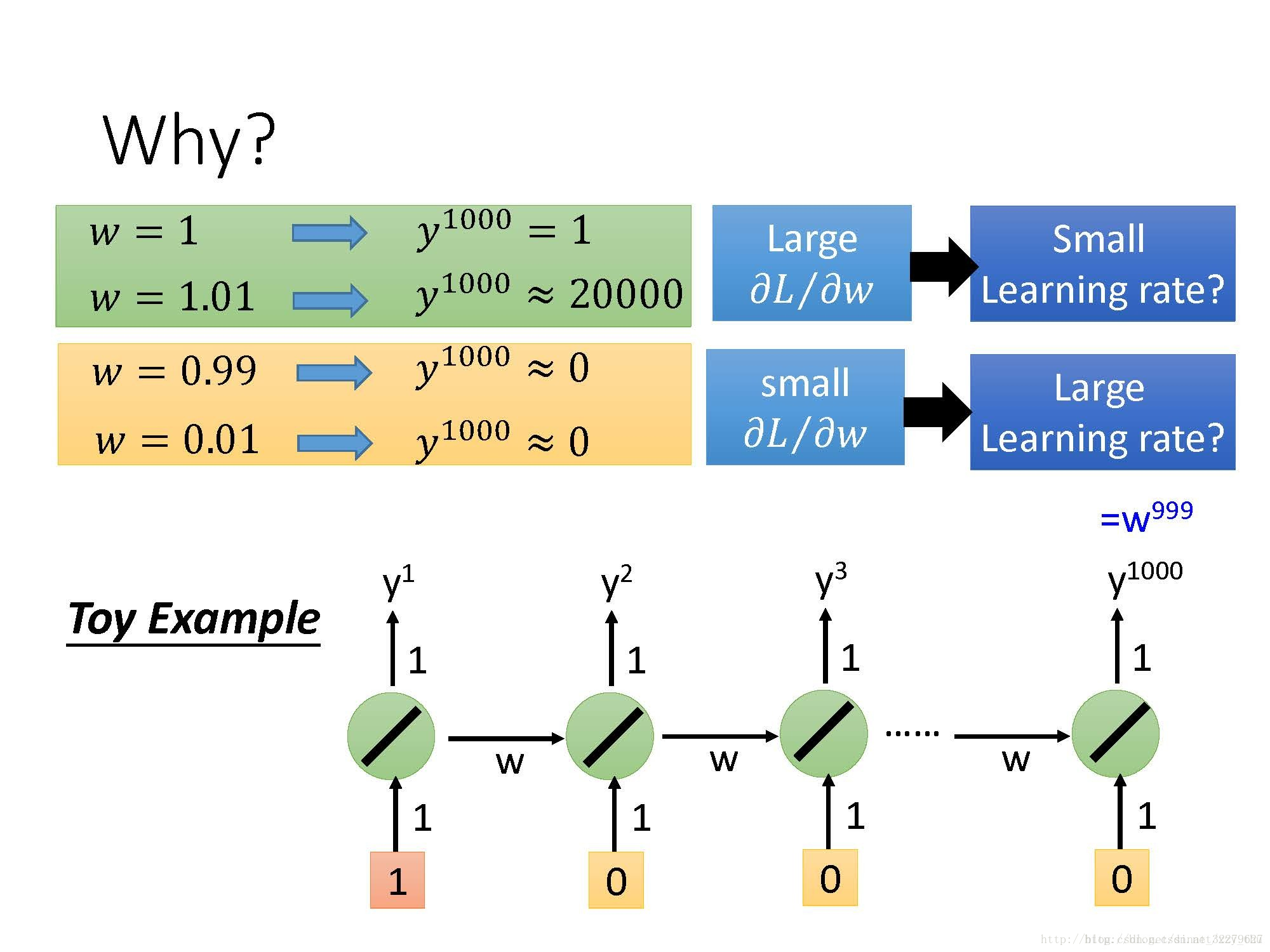 (gradient在w=1处很大,在w=0.99处很小)