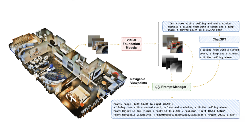 Prompt Manager(提示管理器)· 功能模块:该系统的核心模块负责将视觉模型生成的环境描述与可访问的视点位置及其他相关数据整合成一个综合性的指令。该综合指令会被发送给大型语言模型以确定下一步行动方向。整合后的指令中会包含环境中的物体位置信息(如灯座、沙发),以及可操作的方向指示。