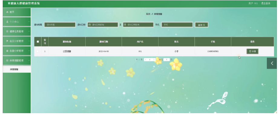 病情提醒管理,在病情提醒管理页面可以对通知标题、通知日期、用户名、姓名、手机等内容,进行详情等操作,如图5-14所示。
