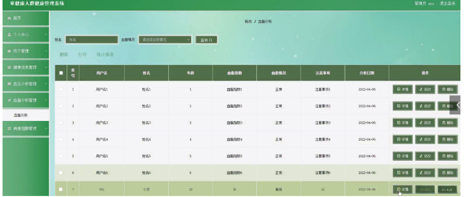血脂分析管理,在血脂分析管理页面可以对用户名、姓名、年龄、血脂指数、血脂情况、注意事项、分析日期等内容,进行详情、修改、删除等操作,如图5-6所示。