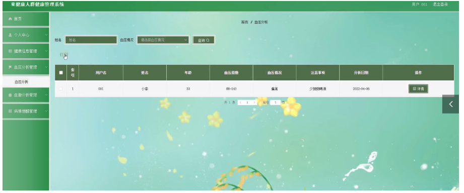 血压分析管理,在血压分析管理页面可以对用户名、姓名、年龄、血压指数、血压情况、注意事项、分析日期等内容,进行详情等操作,如图5-12所示。