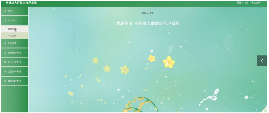 用户通过输入账号、密码登录到亚健康人群健康管理系统后台后,可以对首页、个人中心、健康信息管理、血压分析管理、血脂分析管理、病情提醒管理等功能进行相应操作,如图5-10所示。