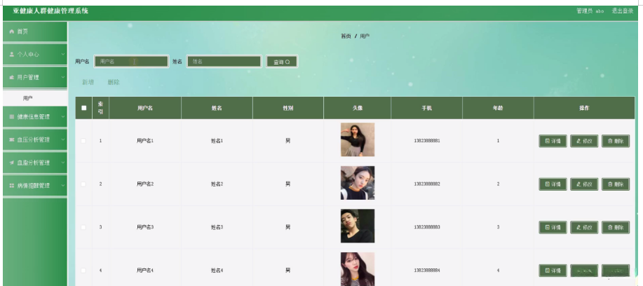 用户管理,在用户管理页面可以对用户名、姓名、性别、头像、手机、年龄等内容,进行详情、修改或删除等操作,如图5-3所示。