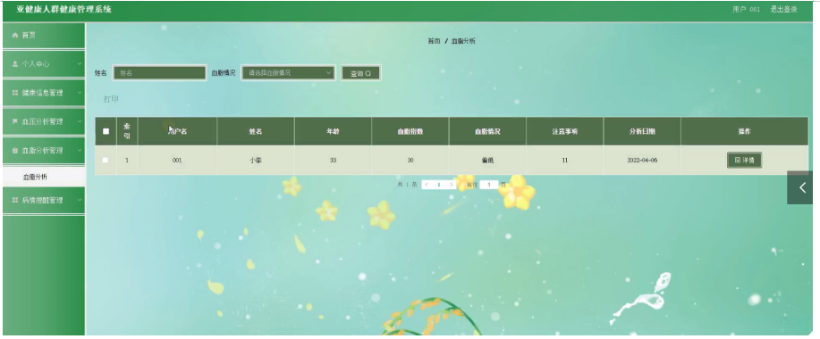 血脂分析管理,在血脂分析管理页面可以对用户名、姓名、年龄、血脂指数、血脂情况、注意事项、分析日期等内容,进行详情等操作,如图5-13所示。