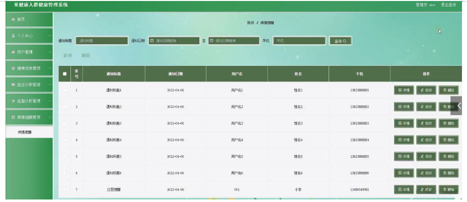 病情提醒管理,在病情提醒管理页面可以对通知标题、通知日期、用户名、姓名、手机等内容,进行详情、修改、删除等操作,如图5-7所示。
