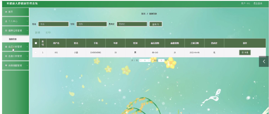 健康信息管理,在健康信息管理页面可以对用户名、姓名、手机、年龄、性别、血压指数、血脂指数、上报日期、患病史等内容,进行详情等操作,如图5-11所示。