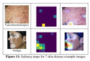 显著性映射可用于可视化模型如何预测具有给定输入的每个类。生成的热图提供了一种直观可视化的方法,在诊断时,模型关注最多的像素位置。可以看出,该模型大多集中在病灶所在的位置。