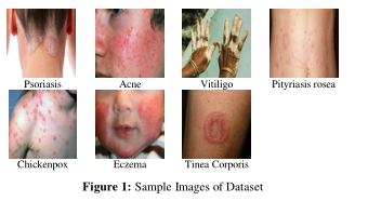 该数据集来自公共可访问的皮肤病学知识库,皮肤病学彩色图集和手动拍摄的组合。从网上公共访问皮肤病学知识库收集的图像是由皮肤科医生验证的。收集的数据图像包括痤疮、湿疹、玫瑰糠疹、牛皮癣、体癣、水痘和白癜风。