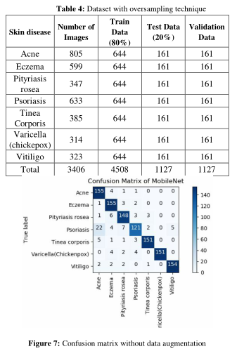 图7-8显示了在没有数据增强和使用过采样技术的情况下,模型的混淆矩阵。这说明了系统是如何将大部分银屑病测试图像误分类为痤疮的,然而模型的rank-1准确率仍然是91.8%。表4显示了在皮肤病数据集中如何使用过采样技术。