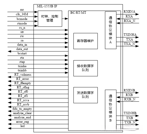 基于MIL-STD-1553B总线协议实现的该IP核;同时参考了HI-6110芯片;支持配置选择三种不同的工作模式:总线控制器(BC)、远程终端(RT)以及总线监控器(MT);采用16位寄存器来存储输入指令字、状态字以及输出数据字;采用深度为32、位宽为16的FIFO缓存用于存储数据字;数据传输采用了曼切斯特编码方案。