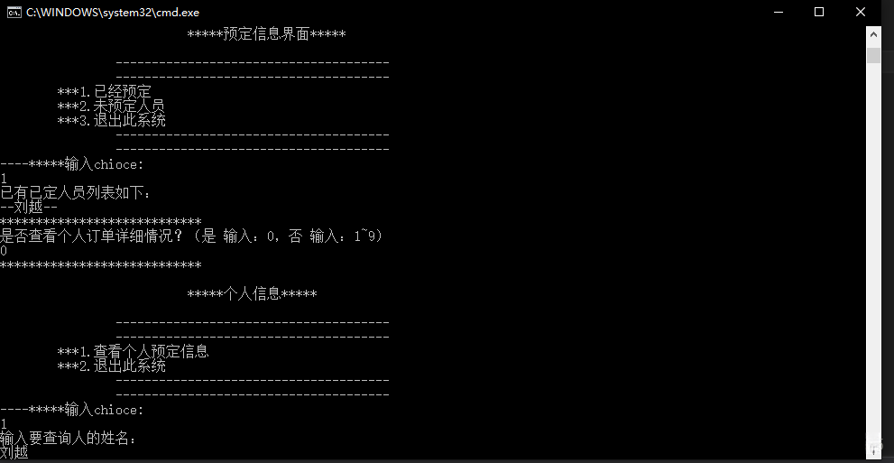 case2://由于人员信息有两个,一个为未预定(表示需要退票的,),一个为已经预定的,另外已经预定了的,有已经预定了人员名单列表,当然,为了解决客户想看已预定中某个人的订单信息,这里还设置一个选择调用函数。进行功能满足。