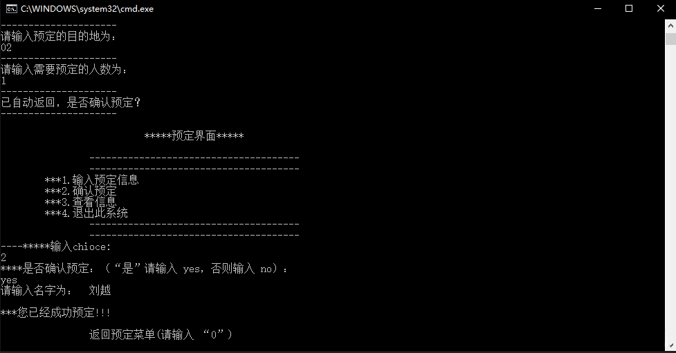 cout<< "返回预定菜单,请输入 “0”" << endl;