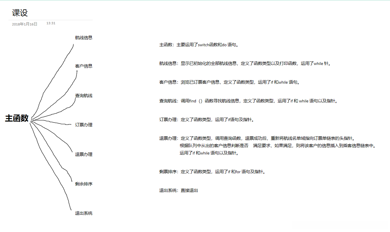 程序大体形式为:先主程序,主程序界面提供多个模块的选择,每个模块对应相应的函数调用。我这里的预定函数和退票函数是分开的,一个为简单链表,一个为简单链队。但是他们都能对航班信息模块的信息进行更改。总的来说,此程序包含三个模块(1、航班信息2.客户信息。(预定信息在这个模块里面)3.退票信息)