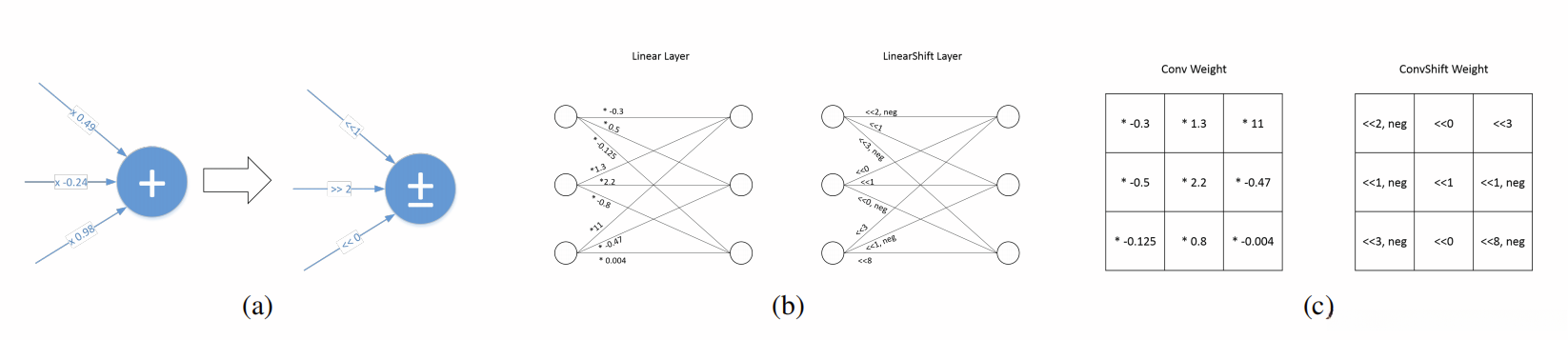 图1:(a)乘法运算和累加运算(MAC)是大多数神经网络的核心操作,在DeepShift架构中已被取代为基于按位移位和加减运算的设计。(b)该系统采用了原始线性运算器与其改进版移位线性运算器的对比分析。(c)通过比较原始卷积运算器与其优化版本的移位卷积运算器性能参数