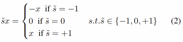 然而,在神经网络中的搜索空间内乘积必须等于负数值尤其是在卷积神经网络中包含正负值滤波器能够有效检测边缘因此我们需要进行符号翻转操作我们采用三元运算符该运算符具有三个元素:一个是原始的操作数另一个是其相反数第三个是零