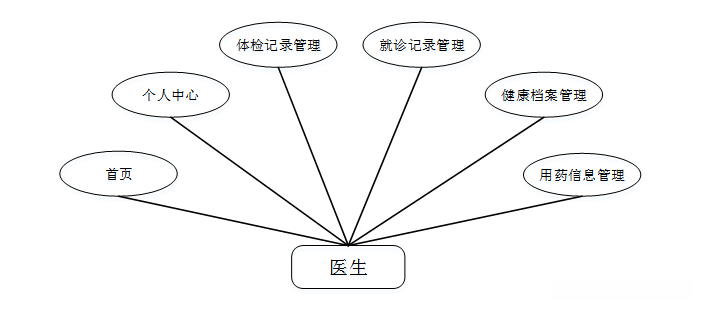 (4)医生模块主要包括首页,个人中心,体检记录管理,就诊记录管理,健康档案管理,用药信息管理等功能,医生模块用例图如图3-4所示。
