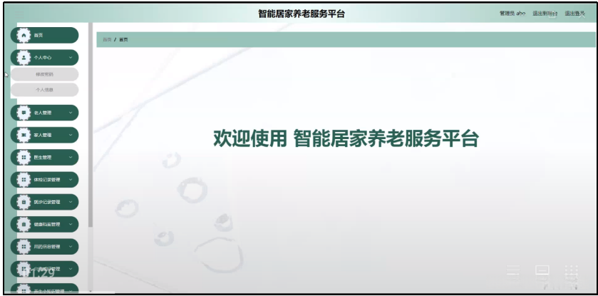 管理员登录系统后,可以对首页,个人中心,家人管理,老人管理,医生管理,体检记录管理,就诊记录管理,健康档案管理,用药信息管理,兴趣爱好管理,养生小知识管理,养老政策管理,留言板管理,系统管理等功能进行相应操作,如图5-7所示。