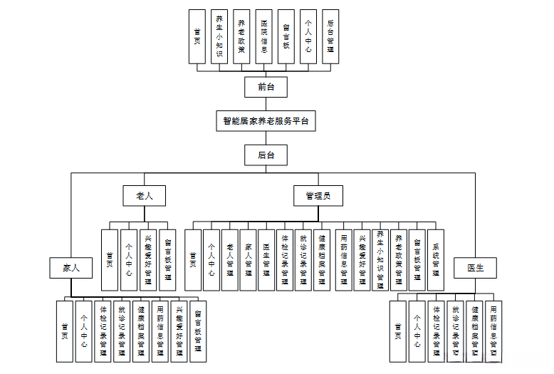 智能居家养老服务平台主要有四类用户。分别是管理员,家人,老人和医生,详细规划如图4-1所示。