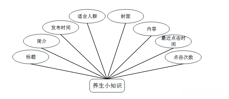 养生小知识实体包括标题,简介,发布时间,适合人群,封面,内容,最近点击时间,点击次数等属性。养生小知识实体图如图4-4所示: