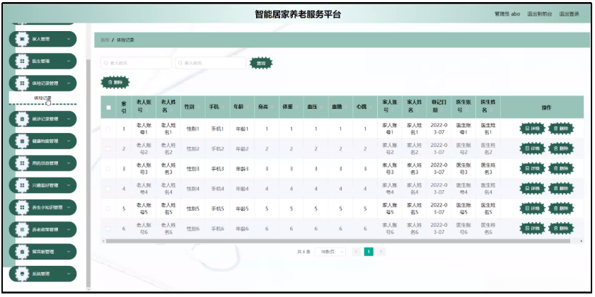 体检记录管理;在体检记录管理页面可以对老人账号,老人姓名,性别,手机,年龄,身高,体重,血压,血糖,心跳登,登记日期等内容进行详情或删除等操作,如图5-10所示。