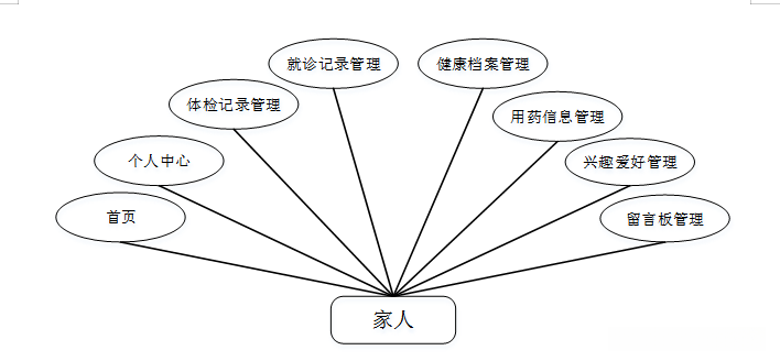 (3)家人模块主要包括首页,个人中心,体检记录管理,就诊记录管理,健康档案管理,用药信息管理,兴趣爱好管理,留言板管理等功能,家人模块用例图如图3-3所示。