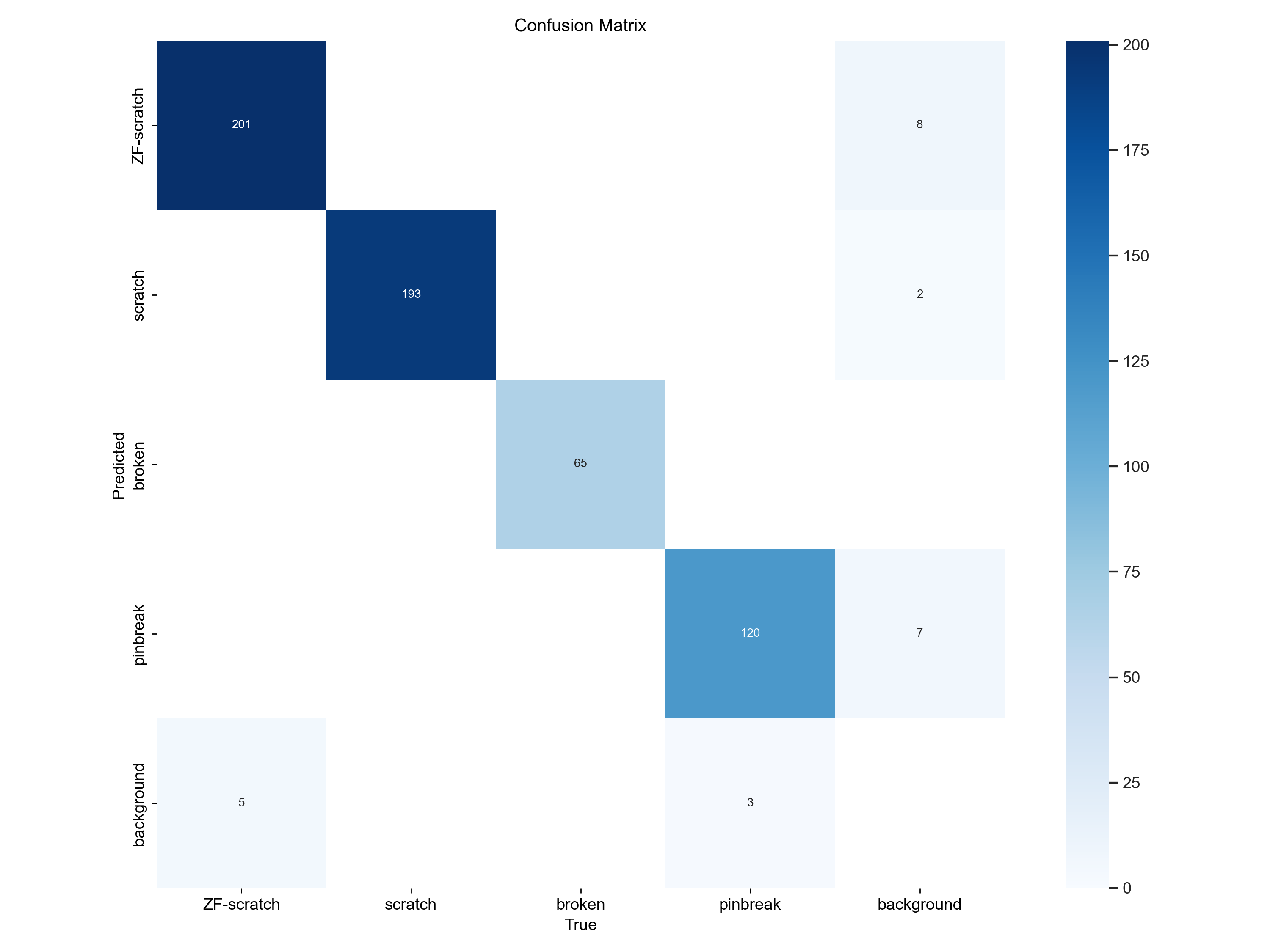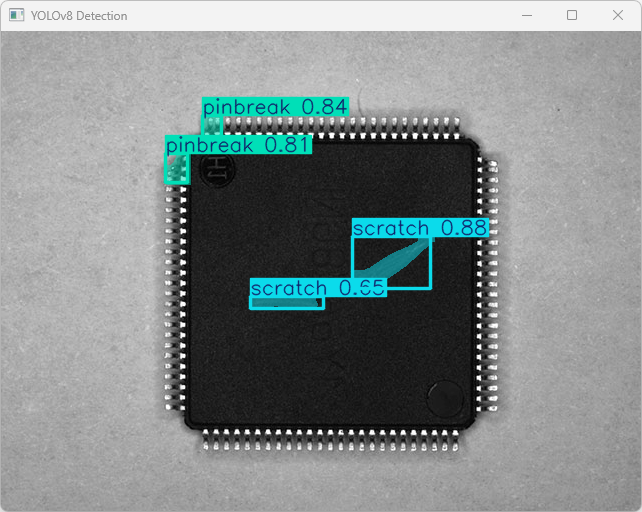 (1)模型在图片中检测到:2个 scratchs(划痕)和 2个 pinbreaks(引脚损坏)。