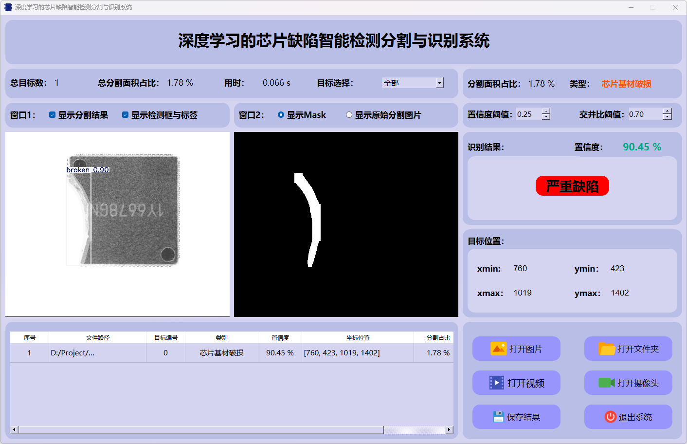 检测结果:系统识别出图片中的芯片缺陷分割图像情况,并显示检测结果,包括总目标数、用时、目标类型、置信度、以及目标的位置坐标信息。