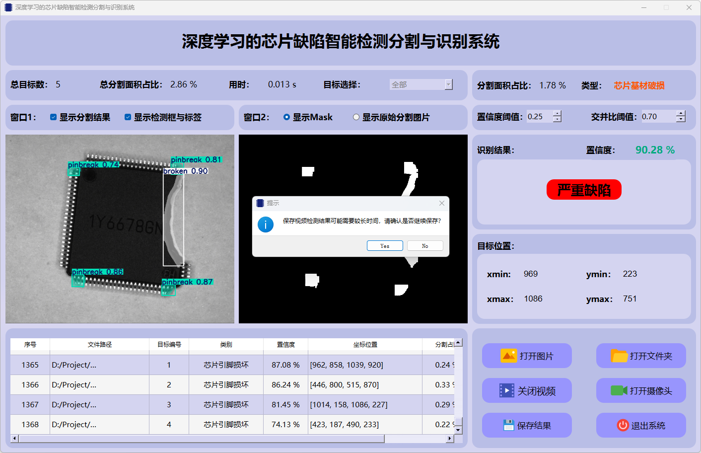检测结果:系统对视频进行实时分析,检测到芯片缺陷分割图像并显示检测结果。表格显示了视频中多个检测结果的置信度和位置信息。