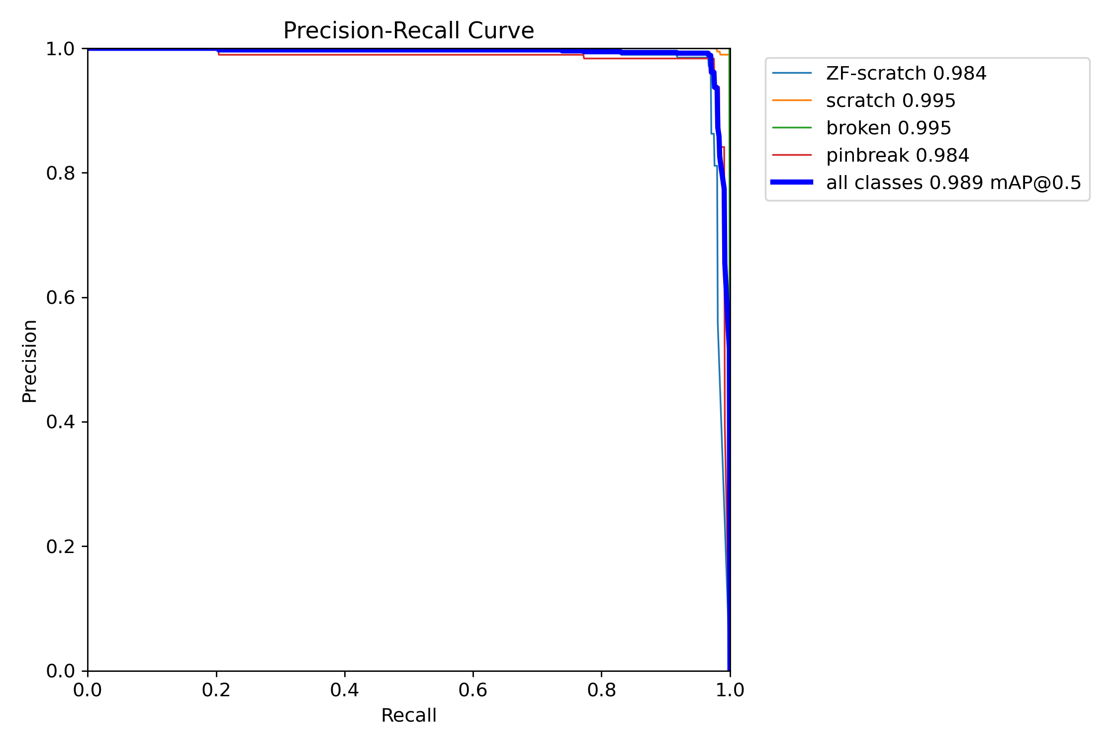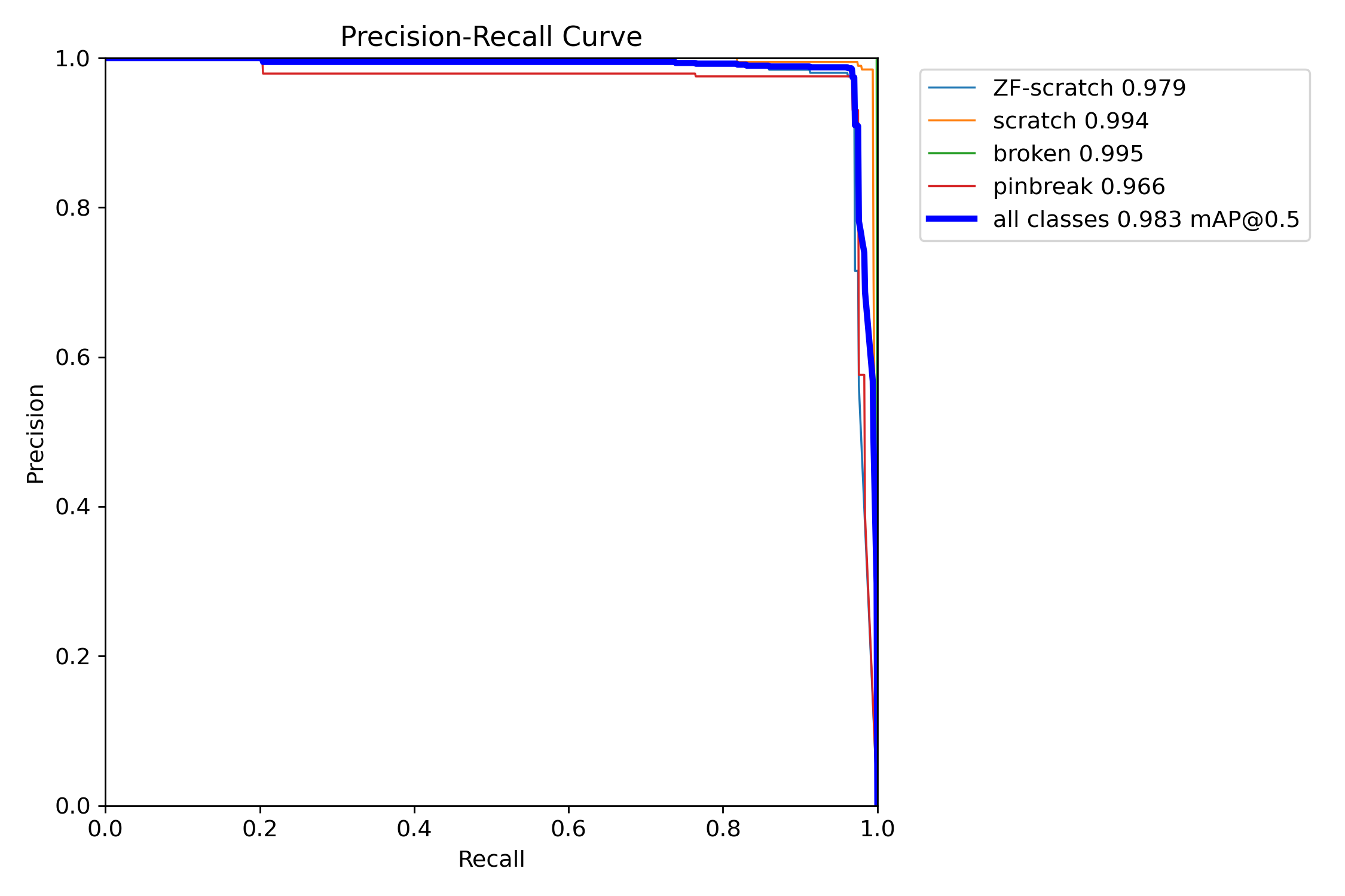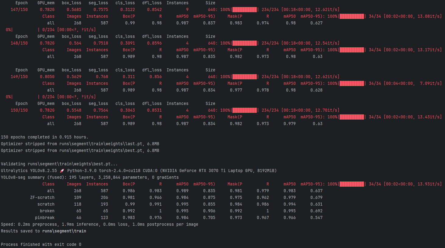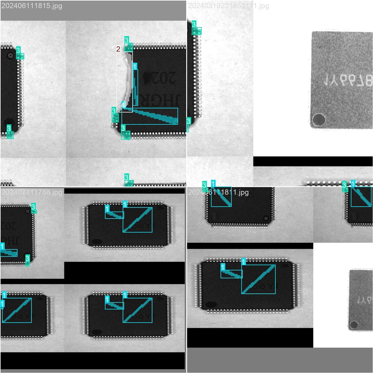 该模型的训练过程表现良好,损失逐渐下降,准确率和 mAP 值持续提高。特别是 pinbreak 类别,表现得几乎完美,模型对各种芯片缺陷的检测精度较高。推理速度较快,适合实时检测任务。