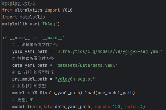 加载名为 yolov8n-seg.pt 的预训练YOLOv8模型,yolov8n-seg.pt是预先训练好的分割模型。