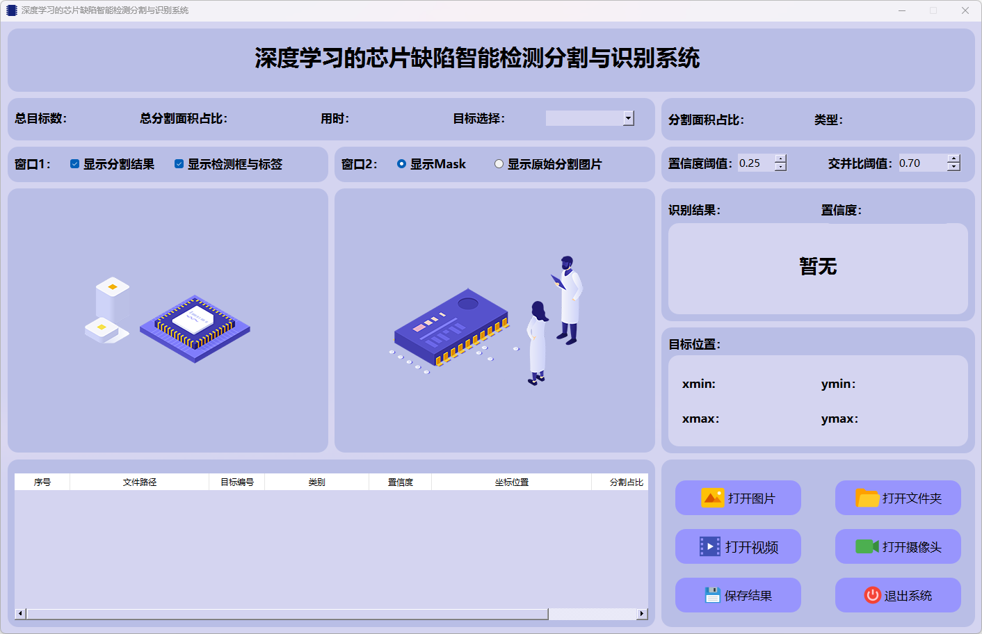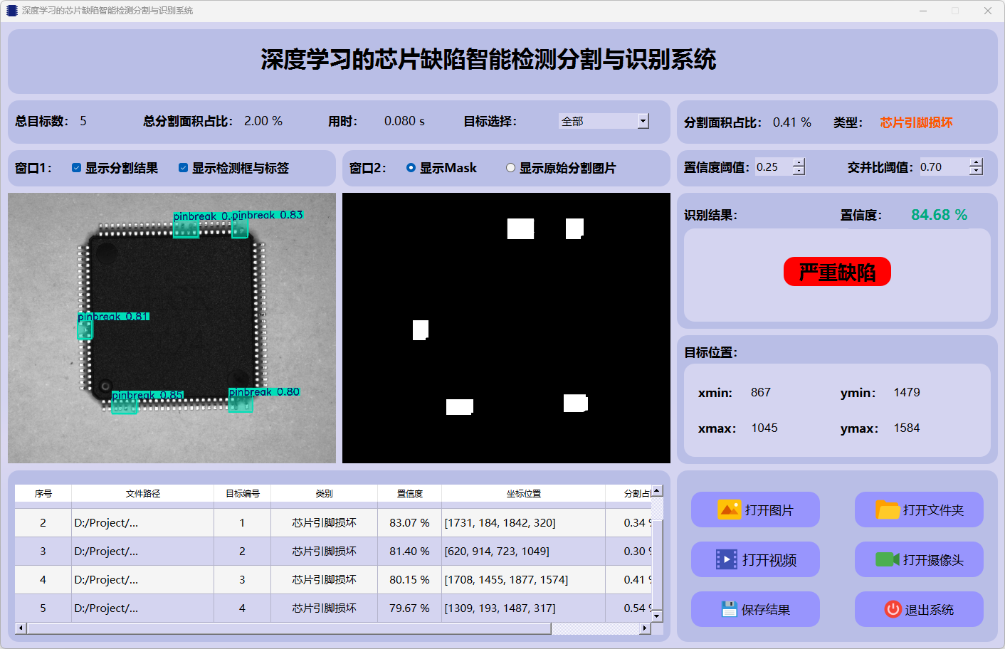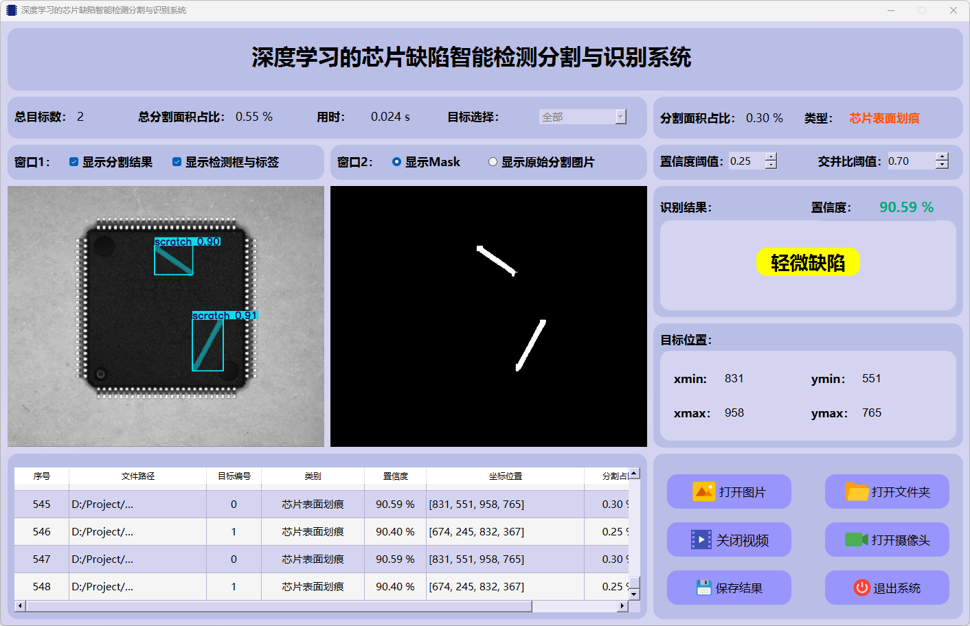 检测结果:系统连接摄像头进行实时分析,检测到芯片缺陷分割图像并显示检测结果。实时显示摄像头画面,并将检测到的行为位置标注在图像上,表格下方记录了每一帧中检测结果的详细信息。