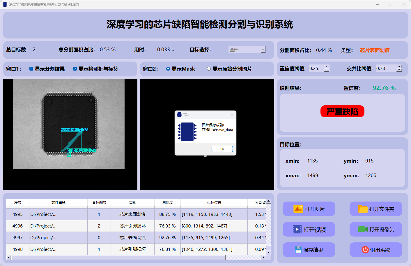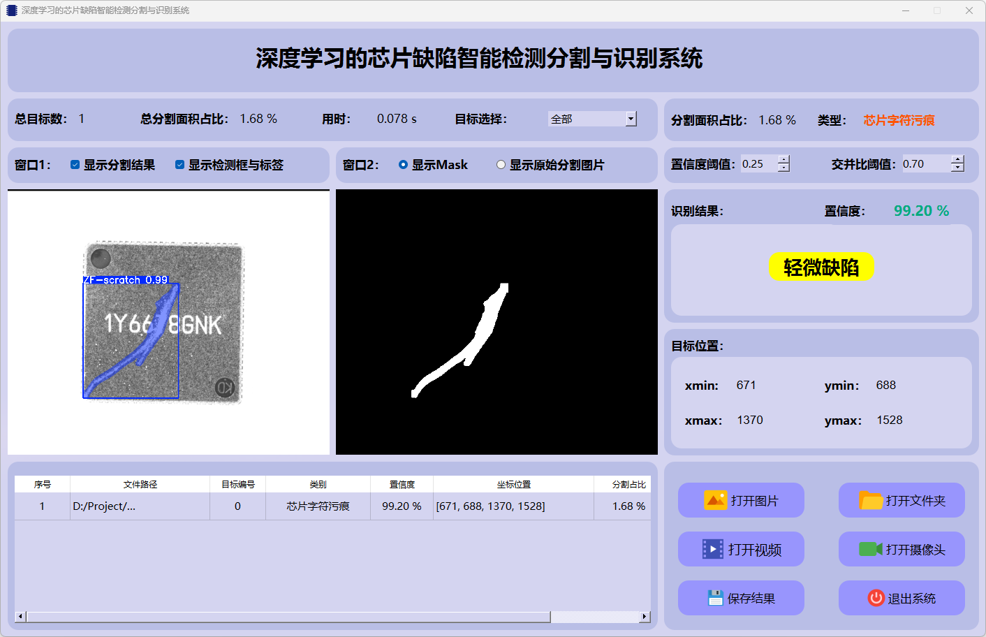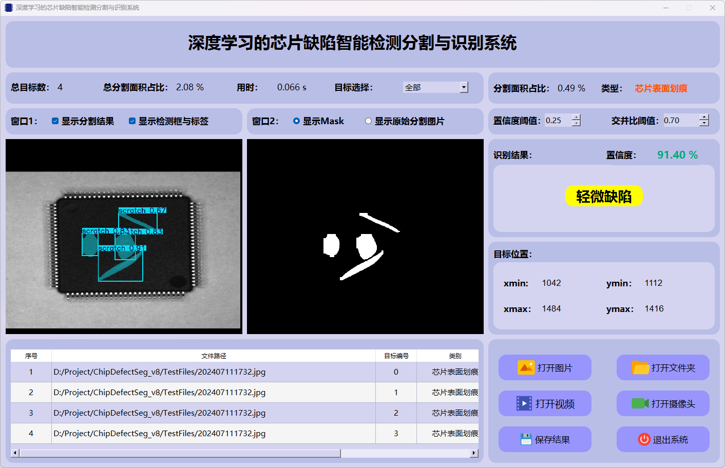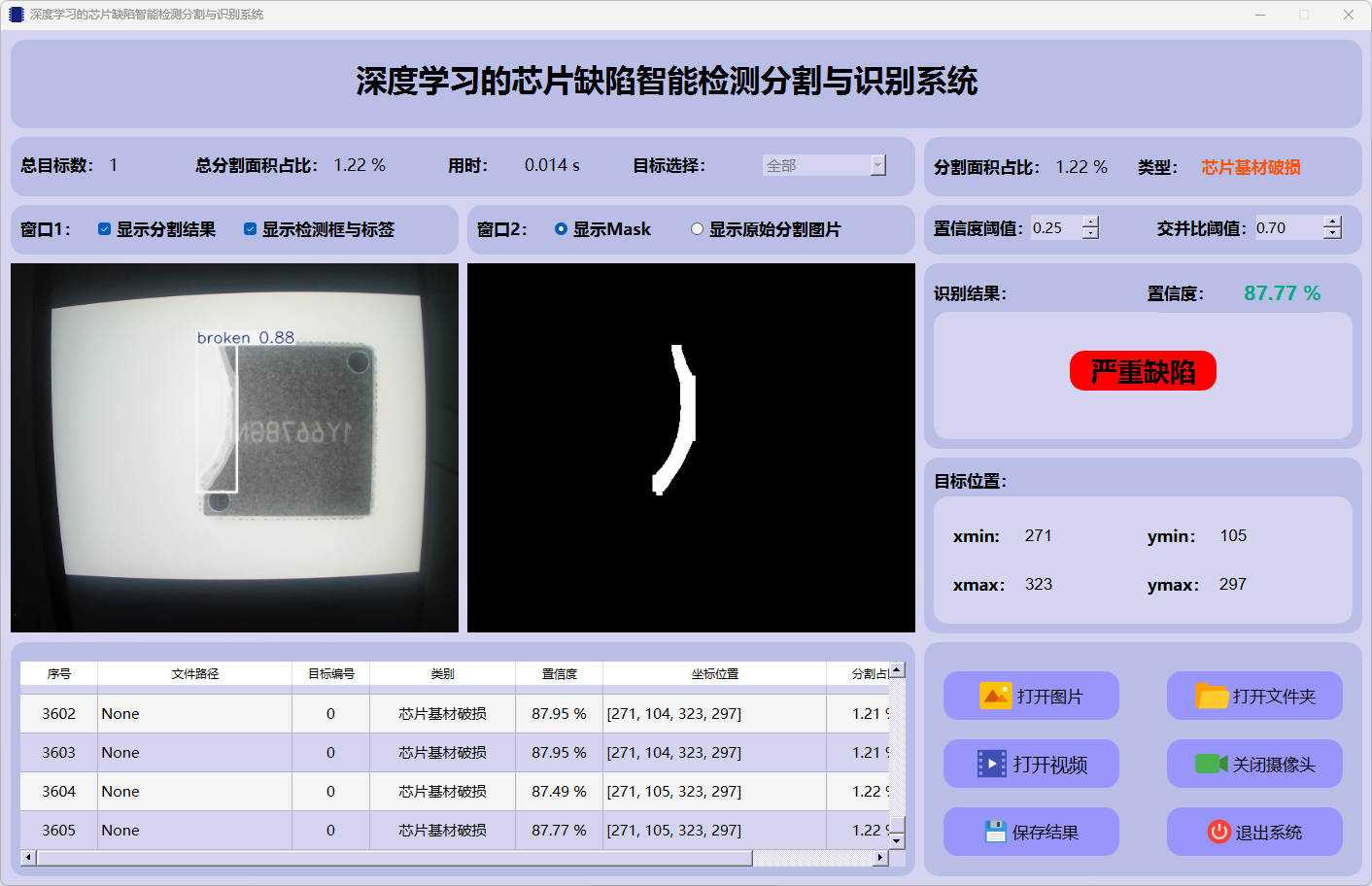 这个界面展示了系统对视频帧中的多目标检测能力,能够准确识别芯片缺陷分割图像,并提供详细的检测结果和置信度评分。