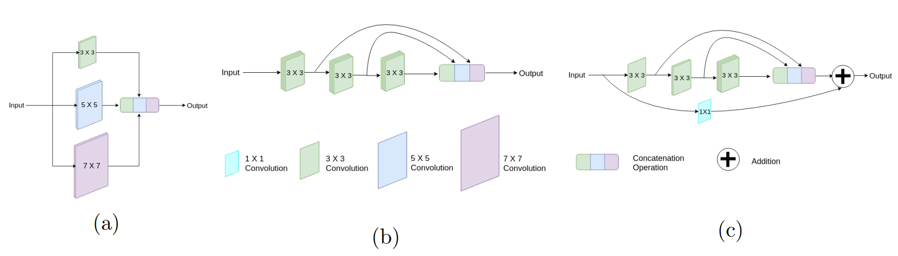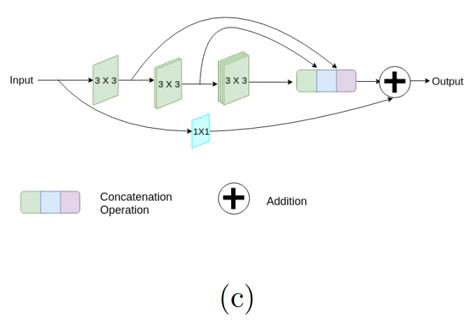图3:MultiRes块的发展。我们从一个简单的Inception-like Blocks开始,通过并行使用3×3、5×5和7×7卷积滤波器,并连接生成的特征图(图3a)。这使我们能够协调来自不同上下文大小的空间特征 。我们没有并行使用3×3、5×5和7×7滤波器,而是将更大更昂贵的5×5和7×7滤波器分解为3×3滤波器(图3b)。图3c显示了MultiRes块,其中我们逐渐增加了连续三层中的滤波器的数量,并添加了一个剩余连接(以及1个×1个滤波器来保存维度)。