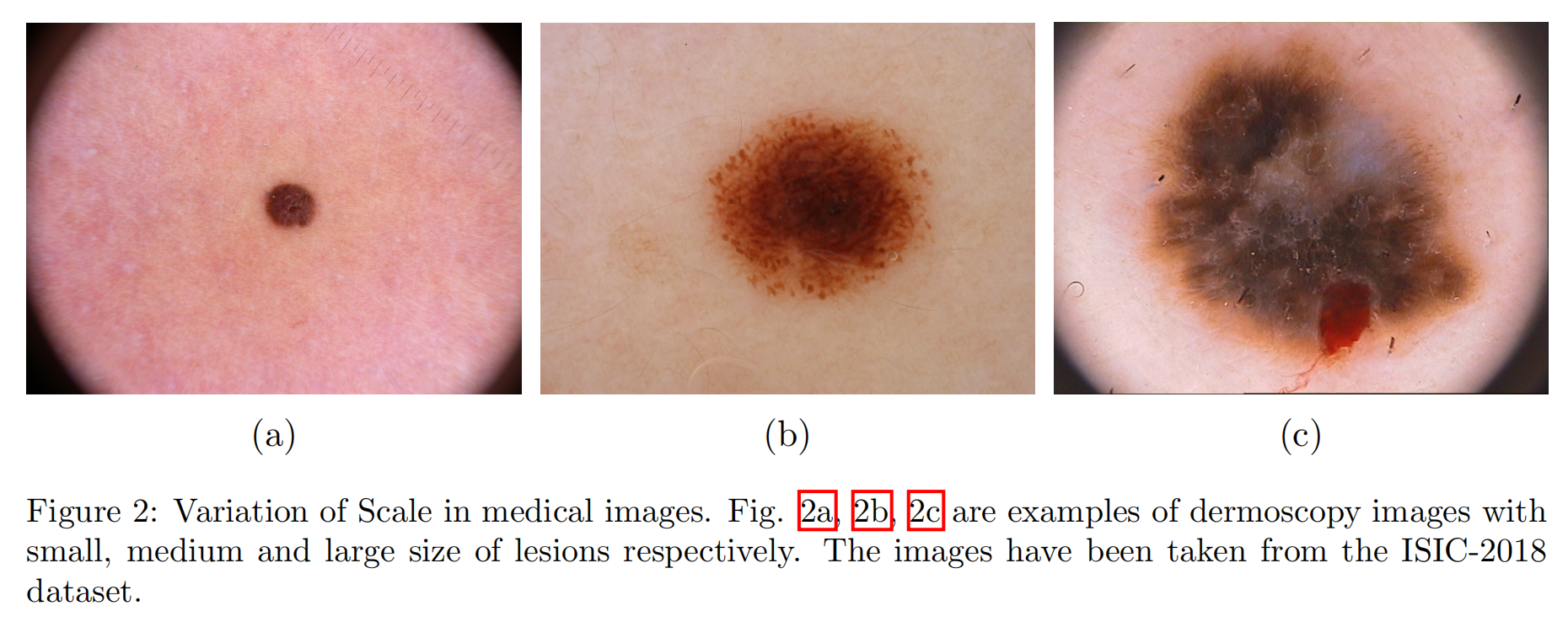 在医学图像分割中,我们感兴趣的是细胞坏死[36]、器官[4]、肿瘤[3]等的分割。来自各种模式的图像。然而,在大多数情况下,这些感兴趣的对象是不规则的和不同的规模(同一类别有不同的表征) 。例如,在图2中,我们已经证明了在皮肤镜图像中,皮肤病变的规模可以有很大的差异。这些情况经常发生在不同类型的医学图像分割任务中。