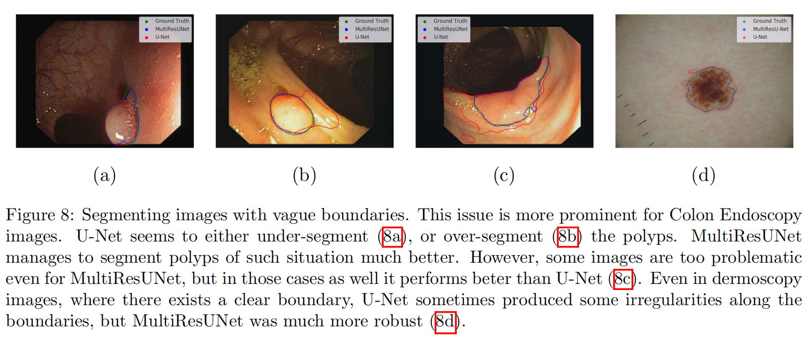 - 特别是,我们检查了一些非常具有挑战性的图像,并观察到使用MultiResUNet时比U-Net得到了显著改进。