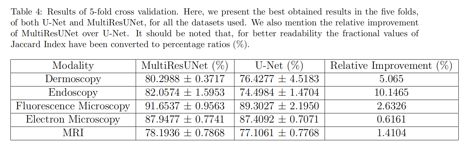 - 我们用不同模式的公共医学图像数据集进行了实验,MultiResUNet显示了较高的精度。
