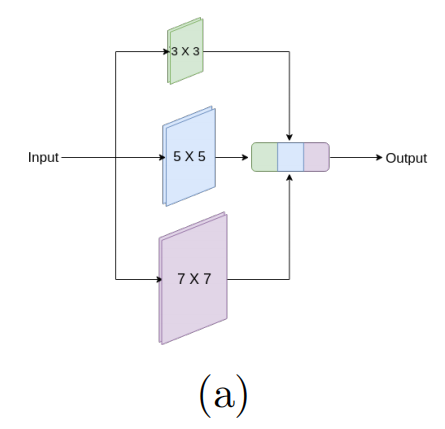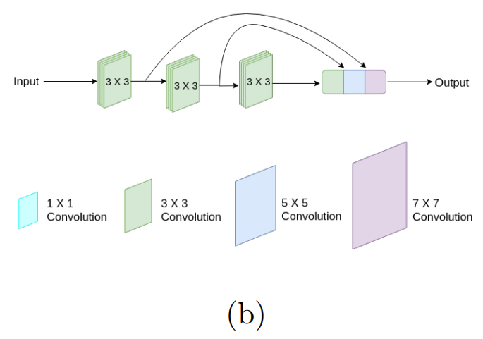 在U-Net架构中,在每个池化层和转置卷积层之后,使用了两个3×3卷积层的序列。正如在[34]中所解释的,这个连续的两个3×3的卷积操作实际上类似于一个5×5的卷积操作 。因此,遵循Inception Network的方法,使用多分辨率分析增强U-Net的最简单方法是将3×3和7×7卷积操作与5×5卷积操作并行,如图3a所示。