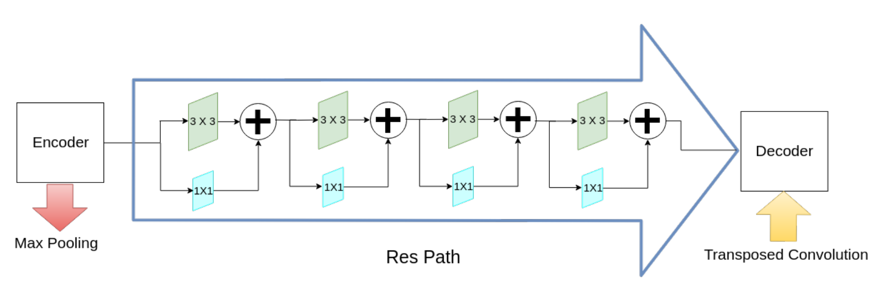 为了协调这两组不兼容的特征集,我们提出了Res path ,它引入了一些额外的处理,使这两个特征映射更加同质 。