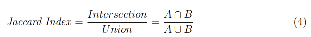 在语义分割中,感兴趣的点通常包括整个图像的一小部分。因此,精确度、召回率等指标是不充分的 ,往往会导致错误的优越感,由于检测背景的完善而被夸大 。因此,Jaccard指数被广泛用于图像分割和目标定位算法[2]的评估和基准。两个集合A和B的Jaccard索引(** IoU系数**)定义为两个集合的交集和并集之比: