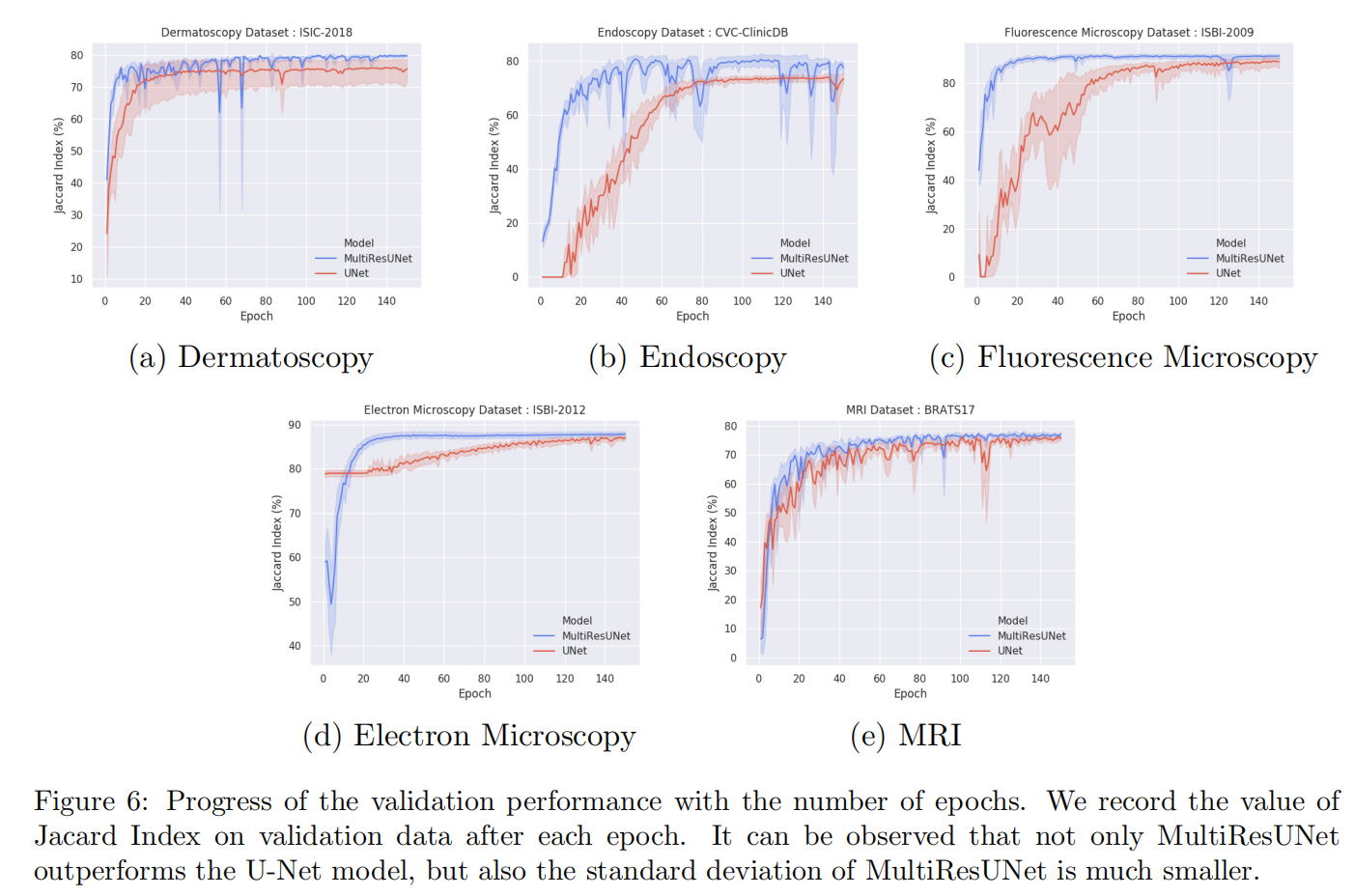 MultiResUNet可以在更少的epochs内获得更好的结果