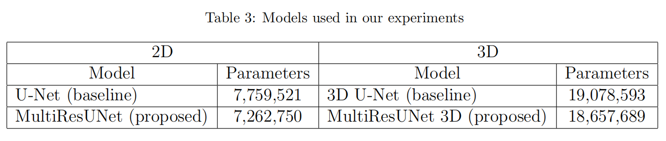 此外,作为三维图像分割的基线,我们使用了U-Net的三维对应的原始论文[28]所述。MultiResUNet的3D版本是简单地用2D卷积层、池化层和卷积层转置的,没有任何进一步的改变。