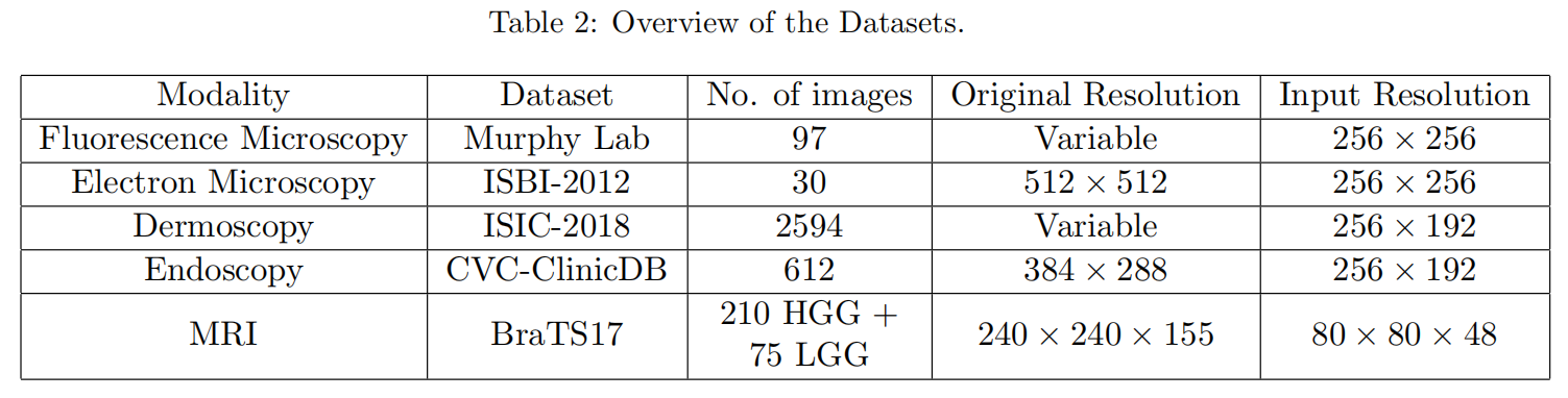 与传统的计算机视觉数据集相比,医学成像数据集的管理具有挑战性。昂贵的成像设备、复杂的图像采集管道、专家注释的必要性、隐私问题——所有这些都增加了开发医学成像数据集[22]的复杂性。因此,只有少数的公共医学成像基准数据集存在,而且每个数据集只包含少量的图像。为了评估所提出的架构的有效性,我们试图在各种图像模式上评估它。更具体地说,我们选择了尽可能彼此异构的数据集。此外,每个数据集本身都提出了一个独特的挑战(更多的细节在第7节和第8节中给出)。下面简要描述了实验中使用的数据集(概述也见表2)。