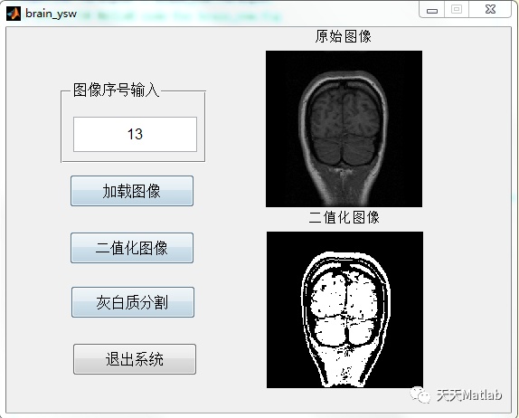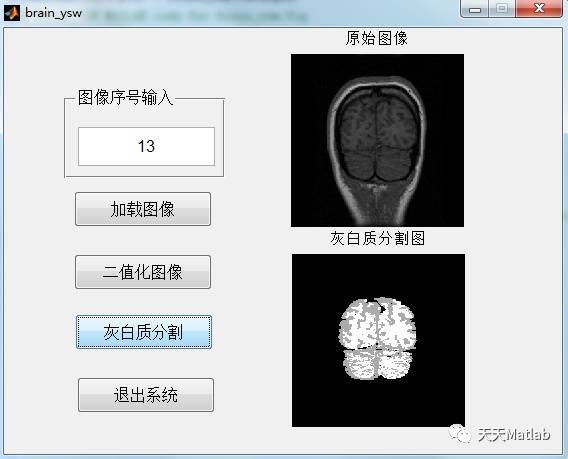 function varargout = brain_ysw(varargin)% BRAIN_YSW MATLAB code for brain_ysw.fig% BRAIN_YSW, by itself, creates a new BRAIN_YSW or raises the existing% singleton*.%% H = BRAIN_YSW returns the handle to a new BRAIN_YSW or the handle to% the existing singleton*.%% BRAIN_YSW('CALLBACK',hObject,eventData,handles,...) calls the local% function named CALLBACK in BRAIN_YSW.M with the given input arguments.%% BRAIN_YSW('Property','Value',...) creates a new BRAIN_YSW or raises the% existing singleton*. Starting from the left, property value pairs are% applied to the GUI before brain_ysw_OpeningFcn gets called. An% unrecognized property name or invalid value makes property application% stop. All inputs are passed to brain_ysw_OpeningFcn via varargin.%% *See GUI Options on GUIDE's Tools menu. Choose "GUI allows only one% instance to run (singleton)".%% See also: GUIDE, GUIDATA, GUIHANDLES% Edit the above text to modify the response to help brain_ysw% Last Modified by GUIDE v2.5 10-Jun-2015 13:34:14% Begin initialization code - DO NOT EDITgui_Singleton = 1;gui_State = struct('gui_Name', mfilename, ... 'gui_Singleton', gui_Singleton, ... 'gui_OpeningFcn', @brain_ysw_OpeningFcn, ... 'gui_OutputFcn', @brain_ysw_OutputFcn, ... 'gui_LayoutFcn', [] , ... 'gui_Callback', []);if nargin && ischar(varargin{1}) gui_State.gui_Callback = str2func(varargin{1});endif nargout [varargout{1:nargout}] = gui_mainfcn(gui_State, varargin{:});else gui_mainfcn(gui_State, varargin{:});end% End initialization code - DO NOT EDIT% --- Executes just before brain_ysw is made visible.function brain_ysw_OpeningFcn(hObject, eventdata, handles, varargin)% This function has no output args, see OutputFcn.% hObject handle to figure% eventdata reserved - to be defined in a future version of MATLAB% handles structure with handles and user data (see GUIDATA)% varargin command line arguments to brain_ysw (see VARARGIN)% Choose default command line output for brain_yswhandles.output = hObject;% Update handles structureguidata(hObject, handles);% UIWAIT makes brain_ysw wait for user response (see UIRESUME)% uiwait(handles.figure1);% --- Outputs from this function are returned to the command line.function varargout = brain_ysw_OutputFcn(hObject, eventdata, handles) % varargout cell array for returning output args (see VARARGOUT);% hObject handle to figure% eventdata reserved - to be defined in a future version of MATLAB% handles structure with handles and user data (see GUIDATA)% Get default command line output from handles structurevarargout{1} = handles.output;% --- Executes on button press in pushbutton1.function pushbutton1_Callback(hObject, eventdata, handles)% hObject handle to pushbutton1 (see GCBO)% eventdata reserved - to be defined in a future version of MATLAB% handles structure with handles and user data (see GUIDATA)warning offglobal im_org dataload('data.mat'); % 加载MRI图像数据,整个头颅图像num = str2num(get(handles.edit1,'string'));% 从13 - 31 (32-44取反)if num <13 || num>31 msgbox('num数字不对!num在13-31之间!!!');endim_org = data(:,:,num); % 第 i 帧图像axes(handles.axes1)imshow(im_org);title('原始图像'); % 显示原图像% --- Executes on button press in pushbutton2.function pushbutton2_Callback(hObject, eventdata, handles)% hObject handle to pushbutton2 (see GCBO)% eventdata reserved - to be defined in a future version of MATLAB% handles structure with handles and user data (see GUIDATA)warning offglobal im_org data bwmax_level = double(max(data(:))); if size(im_org,3)==1 im = im_org;else im = rgb2gray(im_org);endim = permute(im,[3 2 1]); % 重置矩阵的维数for i=1:3 im = flipdim(im,i);endim(im<=40/255) = 0; % 剔除灰度值低的部分(脑袋和背景)im(im>=100/255) = 0; % 剔除灰度值高的部分(颅骨和其他的组织)im(:,:,1) = 0; % 剔除大脑灰白质下面的部分灰度部分blk = ones([1 7 7]); % 块操作% im = imerode(im,blk); % 腐蚀% 分离大脑脑组织lev = graythresh(double(im)/max_level) * max_level; % 阈值bw = (im>=lev); % 二值化bw = imrotate(squeeze(bw),90); % 变异复原axes(handles.axes2)imshow(bw);title('二值化图像');% --- Executes on button press in pushbutton3.function pushbutton3_Callback(hObject, eventdata, handles)% hObject handle to pushbutton3 (see GCBO)% eventdata reserved - to be defined in a future version of MATLAB% handles structure with handles and user data (see GUIDATA)axes(handles.axes2)imshow(L);title('灰白质分割图')% --- Executes on button press in pushbutton4.function pushbutton4_Callback(hObject, eventdata, handles)% hObject handle to pushbutton4 (see GCBO)% eventdata reserved - to be defined in a future version of MATLAB% handles structure with handles and user data (see GUIDATA)clc,clear,close allfunction edit1_Callback(hObject, eventdata, handles)% hObject handle to edit1 (see GCBO)% eventdata reserved - to be defined in a future version of MATLAB% handles structure with handles and user data (see GUIDATA)% Hints: get(hObject,'String') returns contents of edit1 as text% str2double(get(hObject,'String')) returns contents of edit1 as a double% --- Executes during object creation, after setting all properties.function edit1_CreateFcn(hObject, eventdata, handles)% hObject handle to edit1 (see GCBO)% eventdata reserved - to be defined in a future version of MATLAB% handles empty - handles not created until after all CreateFcns called% Hint: edit controls usually have a white background on Windows.% See ISPC and COMPUTER.if ispc && isequal(get(hObject,'BackgroundColor'), get(0,'defaultUicontrolBackgroundColor')) set(hObject,'BackgroundColor','white');end