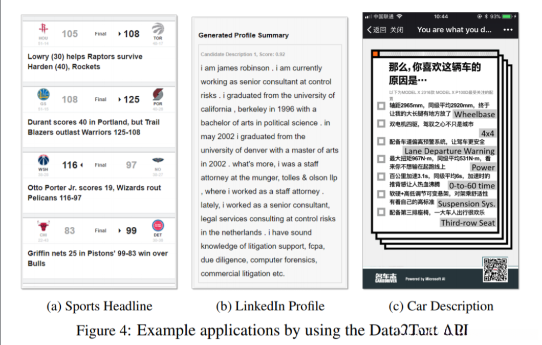 要在第三方应用程序中使用文本生成服务,需要为每个训练模型创建一个API。 一旦通过API发布结构化数据,系统将自动将生成的文本传递回第三方应用程序。 通过这种方式,开发人员可以将开发工作留给Data2Text Studio中的文本生成模型。 图4显示了三种应用场景:体育标题生成,基于LinkedIn数据的用户配置文件生成和汽车评价生成。
