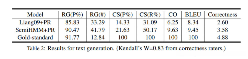 我们还使用第3.2节中描述的相同启发式方法与基线进行比较,测试整个文本生成中提取模板的性能。为了生成文档级文本,我们首先生成一个描述每场比赛的得分线结果的句子,然后是三个描述团队绩效的其他信息的句子。在保持不重复使用模板的同时,我们选择按其比赛得分排序的前十名玩家得分最高的模板。我们报告自动指标,包括BLEU得分和基于Wiseman提出的关系提取的指标:精确度和生成中的唯一关系数(RG),内容选择(CS)的精确度和召回率以及内容排序(CO)得分。 除了NLG中各方面的这些自动指标外,我们还对信息正确性进行人工评估(1-5级评级,越高越好)。我们要求四位精通英语并熟悉篮球的人类评估者对30场随机比赛的输出进行评分。结果显示在表2中,其中Kendall的W测量了注释器间的一致性。我们可以观察到,从我们的模型派生的模板确实胜过基线系统的模板。