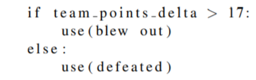 如3.1中所提出的,我们使用高斯分布来模拟数值和短语之间的对齐概率。因此,我们的模型不仅可以告诉我们这个词的来源,还可以告诉我们它与之对齐的数字的分布。例如,在训练之后,我们的模型成功地将“blow out”与分数差异对齐,并且表明当使用此短语时,分数差异的平均值为17。有了这些信息,我们可以在对齐的单词上设置“触发器”。 触发器是一种确定在何种条件下可以使用何种模板的方案。 例如,只有在得分差异大约为17时才能使用与“得分差异”对齐的“blow out”模板,其中 blow out 的概率高于 defeated 的概率。 所以我们可以得到这样的规则: