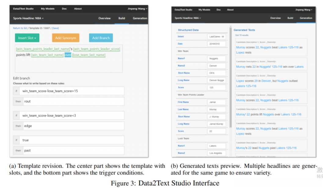 给定结构化数据,系统将使用训练的模型生成相应的文本。 图3b显示了NBA标题生成的示例。 左侧显示包含比赛属性的输入结构化数据。 右侧显示了此比赛的多个生成文本,以帮助开发人员检查生成的文本的质量。