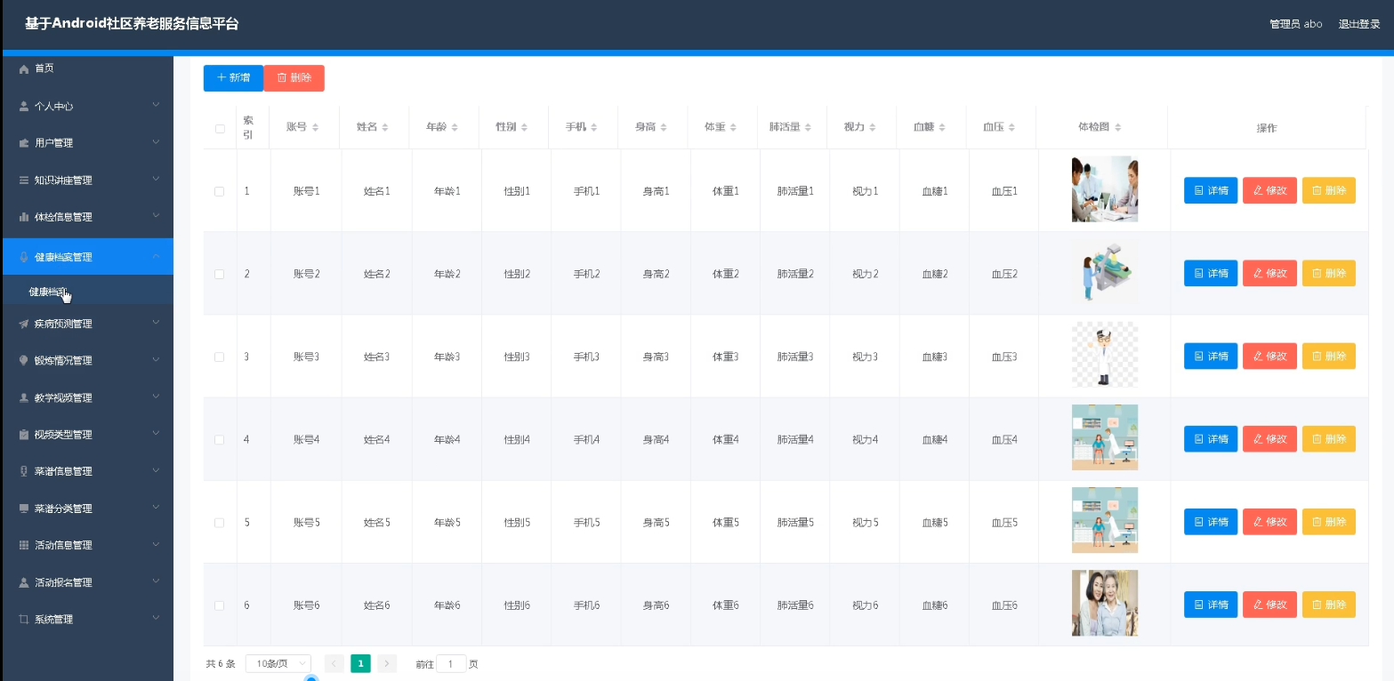 该系统采用Android与Java作为主要开发语言,并基于Android平台构建了相应的服务信息管理系统。在系统架构设计中,默认角色划分包括管理员和普通用户两大类角色类型。具体而言,在管理员端主要包含:个人中心配置管理、用户管理模块维护、知识讲座内容发布与管理、健康体检数据记录与分析等功能;而普通用户端则提供首页信息浏览、教学视频观看与下载、营养菜谱查询等功能。通过合理划分功能模块并建立完善的操作流程,在保障系统稳定运行的同时实现了对各类用户的全面服务